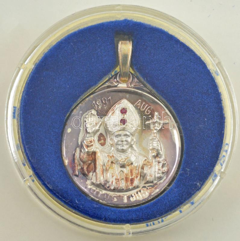 Description: 1991. "II. János Pál pápa Magyarországon" kétoldalas Ag emlékérem füllel, előlapján 2db rubinnal díszítve, tanúsítvánnyal, eredeti díszkiadásban (0,999/~29mm) T:1- patina