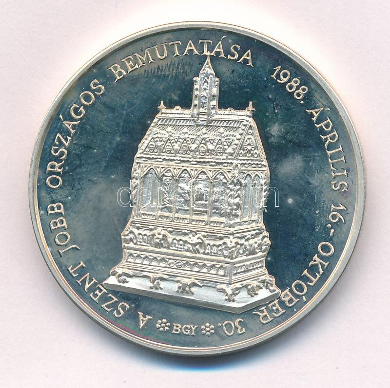 Description: Bognár György (1944-) 1988. "Államalapító királyunk halálának emlékére 1038-1988 - MÉE / A Szent Jobb országos bemutatása" kétoldalas jelzett Ag emlékérem (36g/0,835/42,5mm) T:1- (PP) ujjlenyomat, patina, kis fo.