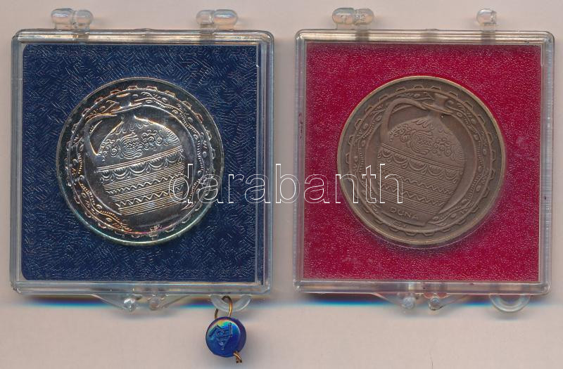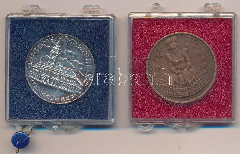 Csúcs Viktória (1934-1993) DN "Hódmezővásárhely Tanácsháza / Korsó" ezüstözött fém emlékérem plombált ÁPV tokban (32mm) + "Népviseletbe öltözött nő / Korsó" bronz emlékérem sérült műanyag tokban (32mm) T:1 patina