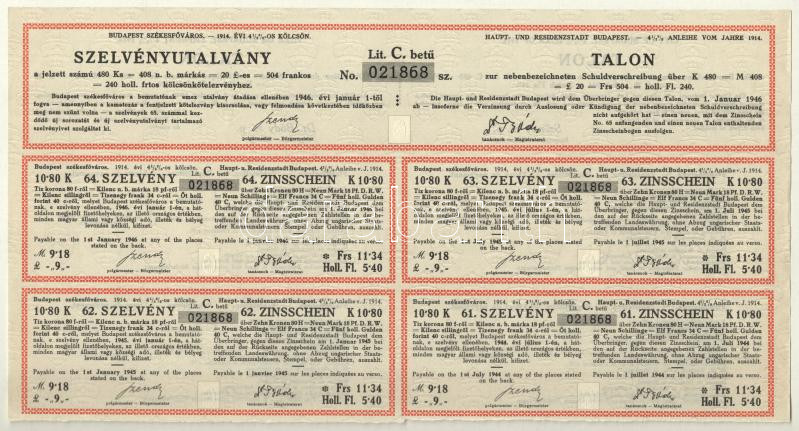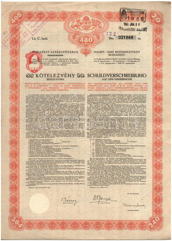 Budapest 1914. "Budapest Székesfőváros - Kötelezvény" 2400K-... https://www.darabanth.com/en/431-Online-auction/431.0/Numismatics/Shares-and-Tickets~1500005/Budapest-1914-Budapest-Szekesfovaros-Kotelezveny-2400K-rol-es-4800K-rol-szarazpecset~II2766604