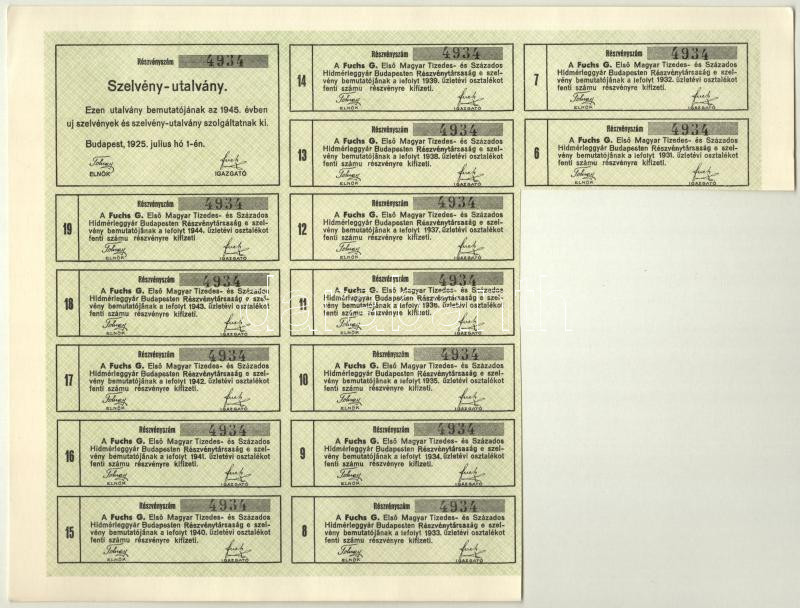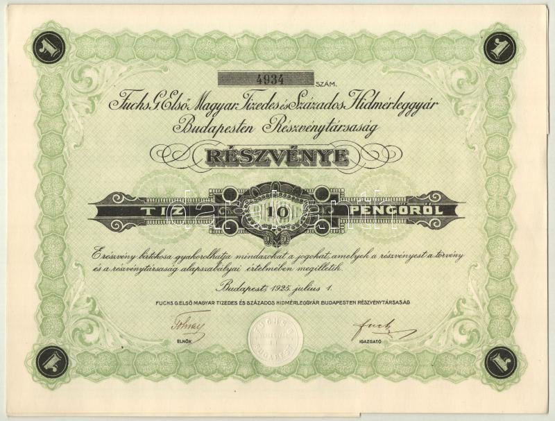 Budapest 1925. "Fuchs G. Első Magyar Tizedes és Százados Hidmérle... https://www.darabanth.com/en/431-Online-auction/431.0/Numismatics/Shares-and-Tickets~1500005/Budapest-1925-Fuchs-G-Elso-Magyar-Tizedes-es-Szazados-Hidmerleggyar-Budapesten-Reszvenyta~II2766547