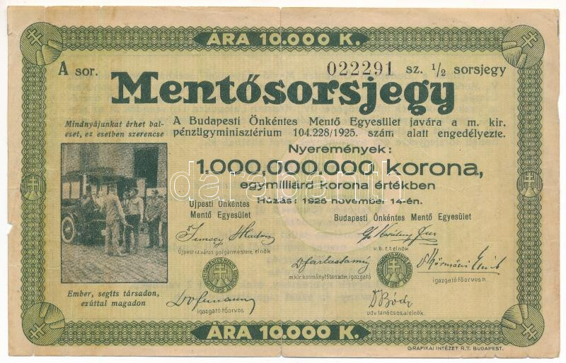 Budapest 1925. "Mentősorsjegy" 1/2 sorsjegy 10.000K értékben, "A 022291" sorszámmal T:III szakadás, kis anyaghiány