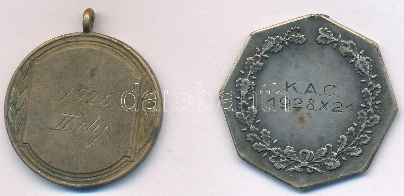 1928. "K.A.C." jelzett Ag díjérem hátoldalán "K.A.C. 1928. X.21." gravírozással, "SGA" gyártói jelzéssel (11,55g/0.800/32mm) + 1926. bronz díjérem füllel, hátoldalán "1926. II. díj" gravírozással (28mm) T:2,2- patina, az egyikről letört a fül