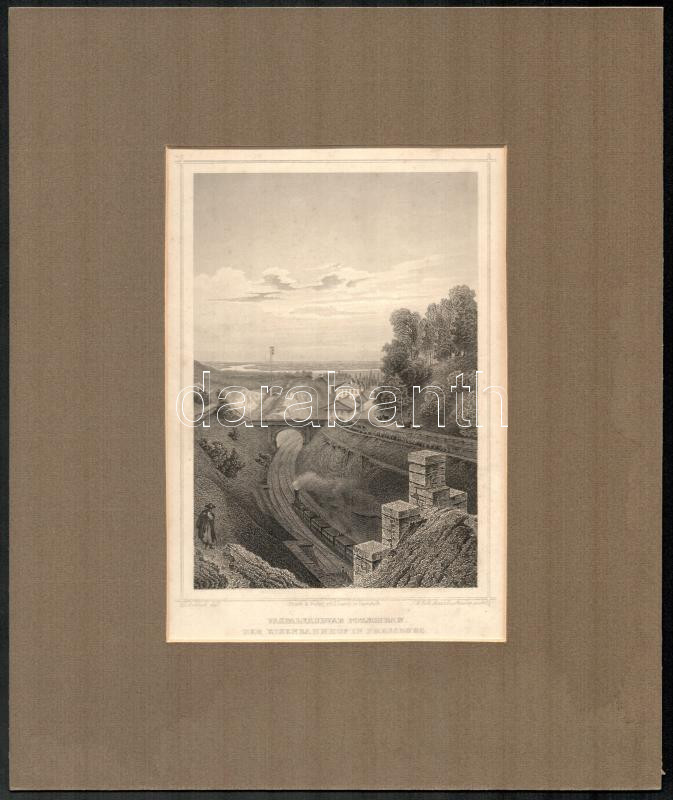 1858 Ludwig Rohbock (1820-1883) - J. M. Kolb: Vaspályaudvar Pozsonyban (Felvidék), acélmetszet, jó állapotban, első paszpartuban, 20×13 cm