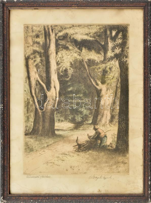 Komjáti-Wanyerka Gyula (1894-1958): Rőzseszedő. Színezett rézkarc, pap...