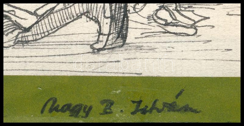 Description: Nagy B. István (1933-2006): "Ne zavarjanak uraim" (karikatúra). Tus, papír. Jelezve jobbra lent. Papírra kasírozva. Nagy B. István autográf ajándékozási soraival. 19,5x29 cm