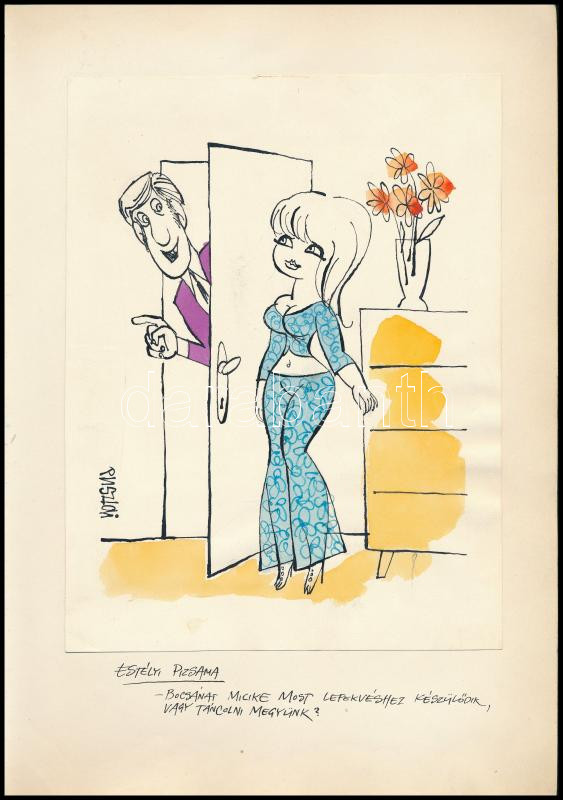 Pusztai Pál (1919-1970): Estélyi pizsama (erotikus karikatúra). Akvare...