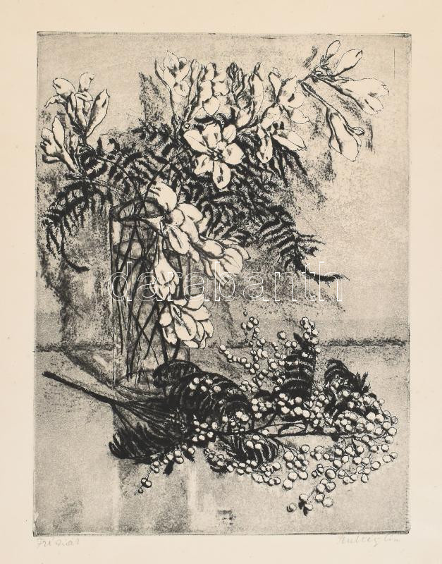 Scultéty Éva (1917-2001): Fréziák. Rézkarc, papír, jelzett, 39x29 cm