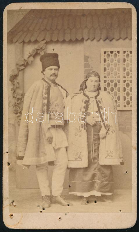 cca 1870 Házaspár népviseletben, keményhátú fotó lyukakkal, 10,5×6,5 c...