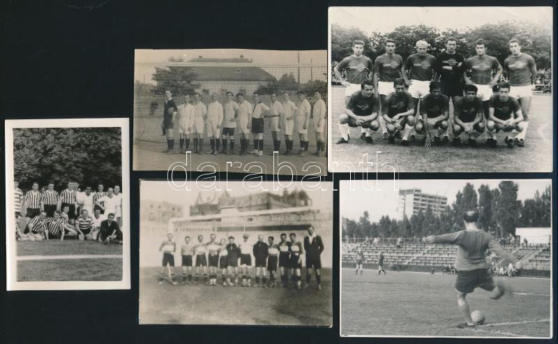 cca 1930-1970 5 db labdarúgással, focival kapcsolatos fotó, közte feliratozottak, 9x6 cm és 12x9 cm között