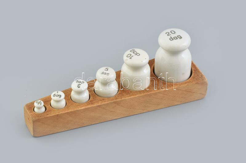 Porcelán súly készlet fa tartóban. Komplett 6 darabos