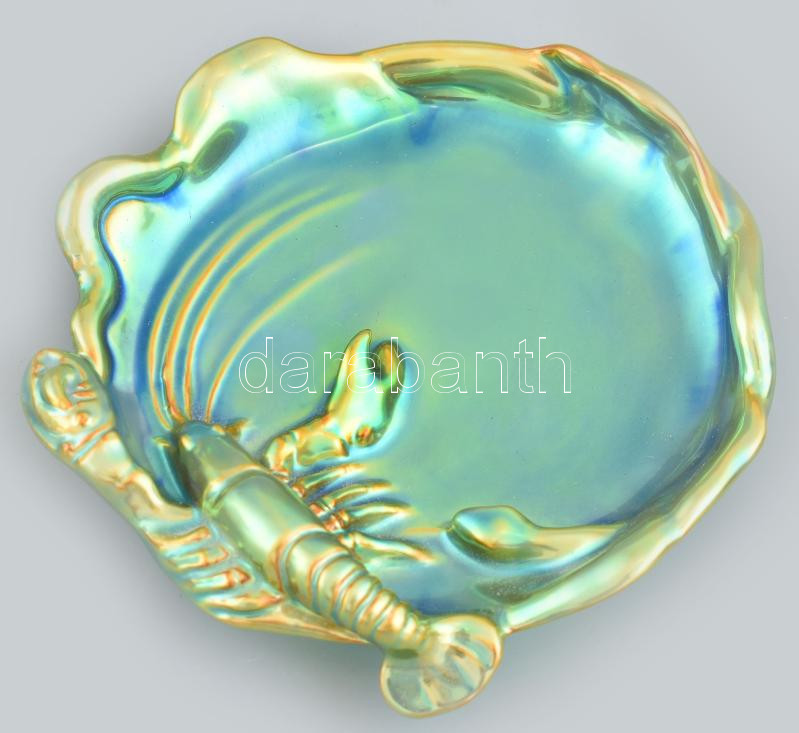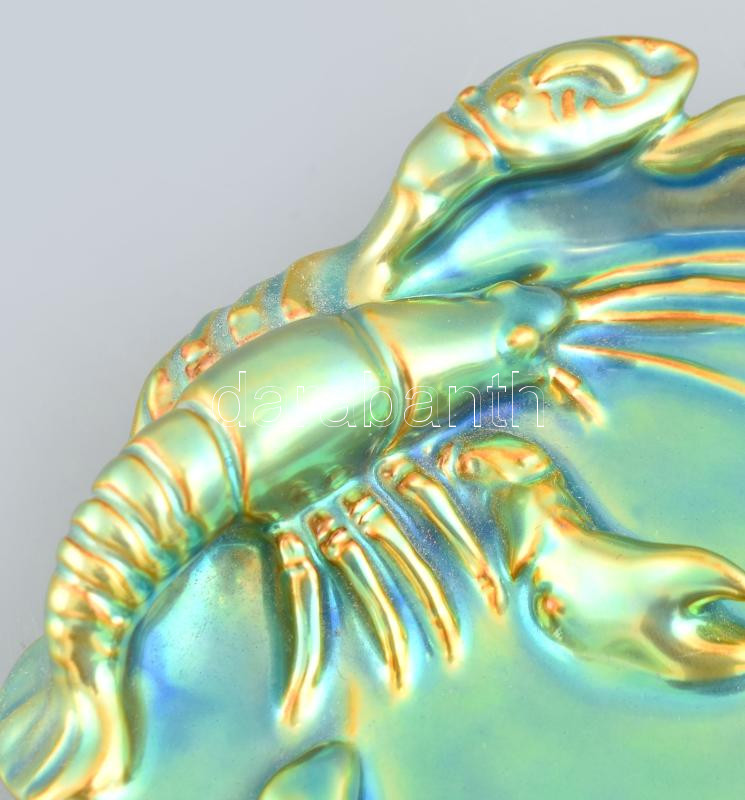 Zsolnay eozin mázas rákos tál, jelzett, erős kopásnyomokkal, d: 15 cm