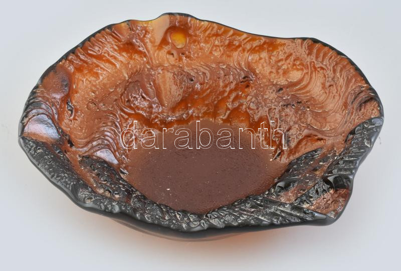Buczkó borostyán üveg kínáló tál. Formába öntött, hibátlan 28 cm