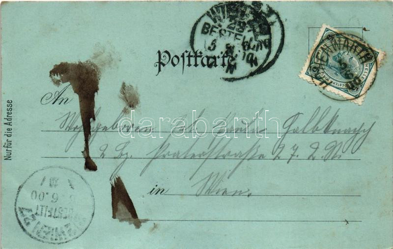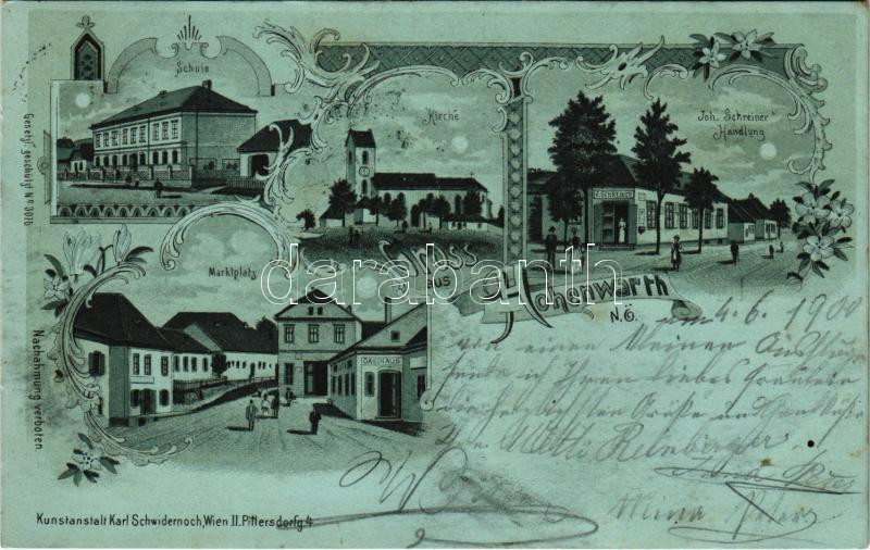 1900 Hohenwarth, Hohenwarth-Mühlbach am Manhartsberg; Schule, Kirche, Marktplatz, Joh. Schreiner's Handlung / school, church, market square, shop. Kunstanstalt Karl Schwidernoch Art Nouveau, floral, Emb. litho (fl)
