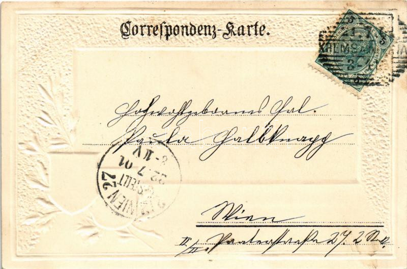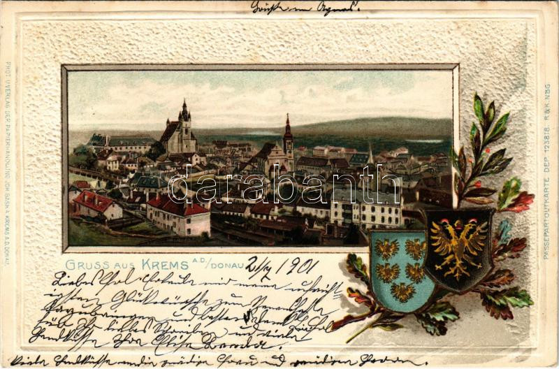 Description: 1901 Krems an der Donau, general view. Phot. u. Verlag der Papierhandlung Joh. Baska. Passepartoutkarte. Art Nouveau, floral, Emb. litho with coat of arms