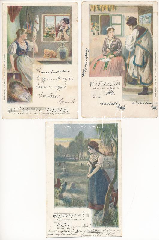 3 db RÉGI hosszú címzéses magyar népviseletes képeslap kottával / 3 pre-1902 Hungarian folklore postcards with music sheets (Walter Haertel)