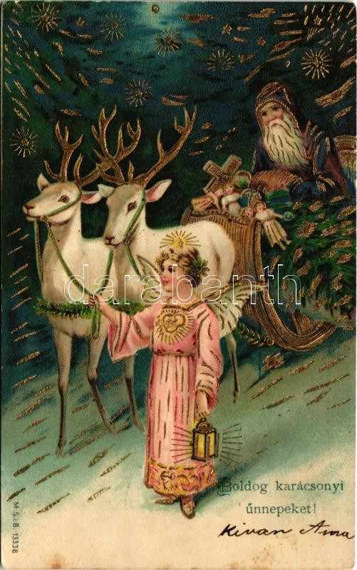 1903 Boldog karácsonyi ünnepeket! / Christmas greeting art postcard with Saint Nicholas, reindeer sleigh and angel. M.S.i.B. Emb. litho (Rb)