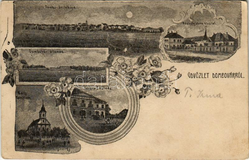 1901 Dombóvár, látkép, Főszolgabírói hivatal, Vasútállomás, Korona szálloda, katolikus templom. Art Nouveau, floral (EK)