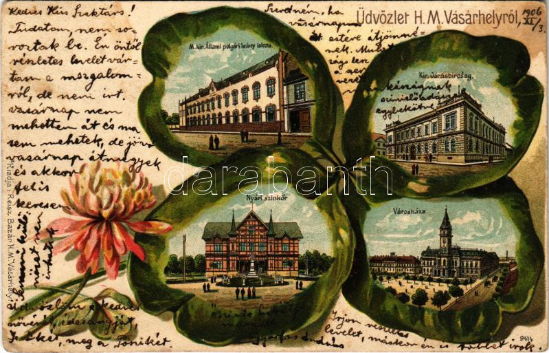 Description: 1906 Hódmezővásárhely, M. kir. állami polgári leányiskola, Kir. Járásbíróság, Nyári színkör, Városháza. Reisz Bazár kiadása. Szecessziós dombornyomott lóherés litho / Art Nouveau Emb. clover litho (fl)