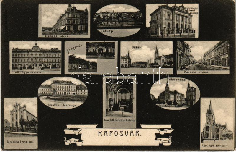 1906 Kaposvár, Erzsébet és Korona utca, Állami főgimnázium, Fő tér, Osztrák-magyar bank palotája, városháza, Római katolikus templom és belseje, Cs. és kir. laktanya, Izraelita templom, zsinagóga. Art Nouveau (EK)