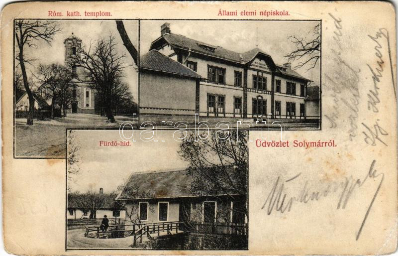 1907 Solymár, Római katolikus templom, Állami elemi népiskola, Fürdő híd. Grohmann Antal kiadása (EK)