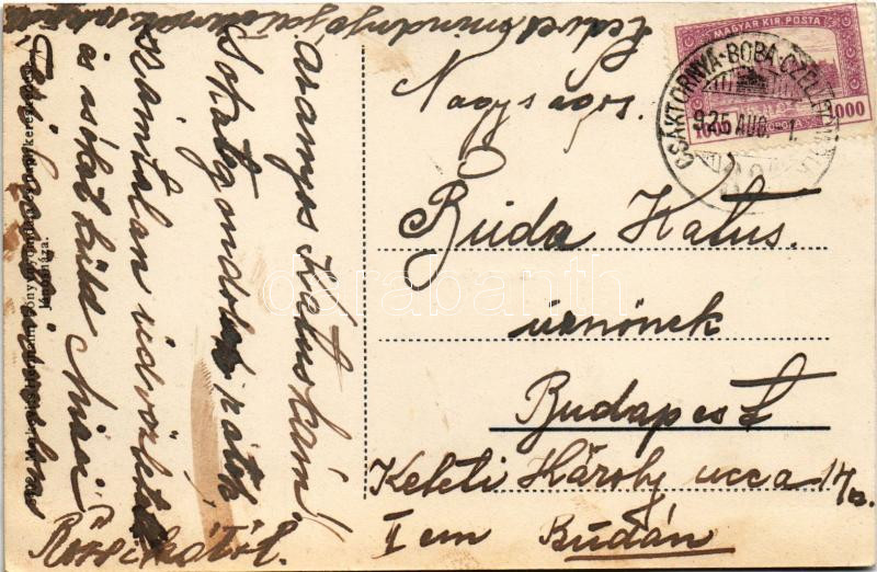 1925 Jánosháza, Forrás fürdőház, Gróf Erdődy Sándor kastély, vasútállomás, Fő utca, izraelita templom, zsinagóga, Központi szálloda, Mária kert, templom + "CSÁKTORNYA-BOBA-CZELLDÖMÖLK 33." vasúti mozgóposta