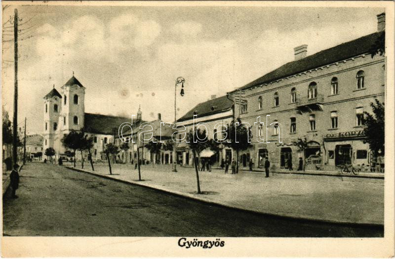 1926 Gyöngyös, Café Korzó kávéház, templom, üzletek (fl)