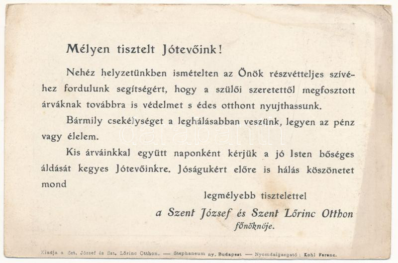 Description: Budapest XVIII. Pestszentlőrinc, Pusztaszentlőrinc, Szentlőrinc; A Szent József és Szent Lőrinc otthon árvái adománygyűjtő lapja, gyerekek (non PC) (EK)