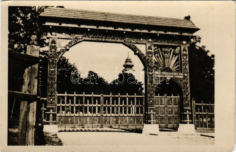Máriabesnyő (Gödöllő), Székelykapu "Épült Székelyföld felszabadulásának emlékére 1943" felirattal. Kapucinus Rendház kiadása (EM)