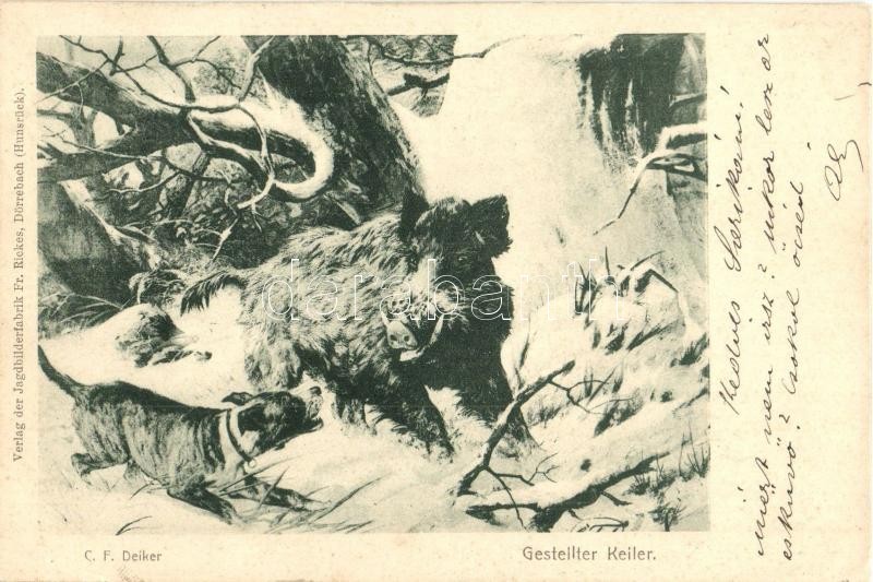 1905 Gestellter Keiler. Jagdbilderfabrik Fr. Rickes / Hunting postcard with wild boar s: C.F. Deiker