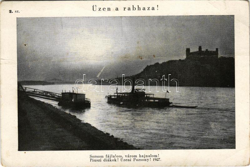 Üzen a rabhaza! 2. sz. Sorsom fájlalom, várom hajnalom! Piuszi diákok! Üzeni Pozsony! 1927. / Hungarian irredenta propaganda, Bratislava (fa)