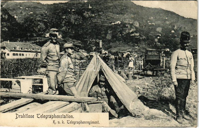 1909 Cs. és kir. távirati ezred vezeték nélküli távíró állomása katonákkal / Drahtlose Telegraphenstation. K.u.K. Telegraphenregiment / Austro-Hungarian Telegraphy Regiment, wireless telegraphy station with soldiers (EK)