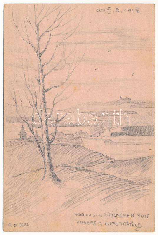 1915 Kézzel rajzolt Tábori Postai Levelezőlap / Fieldpostkarte / WWI Austro-Hungarian K.u.K. military, hand-drawn field postcard (fa)