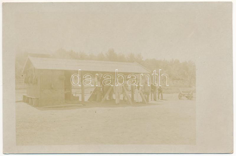 Description: 1915 Pola, Pula; K.u.k. Festungsfeldbahn, a park Platz egy része a kovácsműhely és patkoló, jobbról főhadnagy Jawitz (?), tábori vasútállomás / WWI Austro-Hungarian military railway station, blacksmith shop and horseshoe workshop. photo