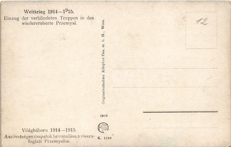 Description: Einzug der verbündeten Truppen in das wiedereroberte Przemysl. Weltkrieg 1914-15. Kilophot 1249. / A szövetséges csapatok bevonulása a visszafoglalt Premyslbe. Világháború 1914-15 / WWI Austro-Hungarian K.u.K. military art (EK)