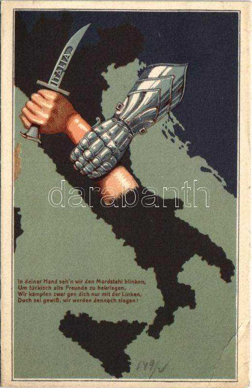 Description: Italia - In deiner Hand seh'n wir den Mordstahl blinken.. Offizielle Karte für Rotes Kreuz, Kriegsfürsorgeamt, Kriegshilfsbüro Nr. 149. / Első világháborús olasz-ellenes katonai propaganda / WWI Austro-Hungarian K.u.K. military art postcard, Anti-Italian propaganda. litho (EB)