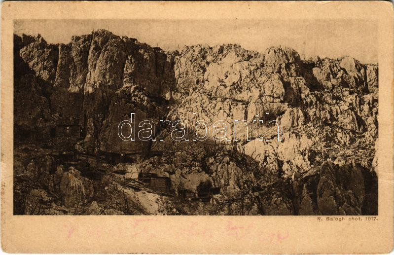 Description: Mte. Sabotino. Reingewinn zugunsten der Witwen und Waisen von Gefallenen an der Isonzofront. Isonzofonds Feldpost 515. Serie III. / Első világháborús katonai állás a Sabotin hegygerincen az Isonzo fronton. R. Balogh phot. 1917 / WWI K.u.k. Austro-Hungarian military (fa)