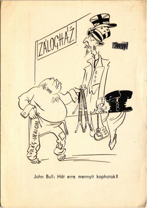 John Bull: Hát erre mennyit kaphatok? Zálogház. Dinnyés Károly rajza. ... https://www.darabanth.com/en/431-Online-auction/431.0/Postcards/Propaganda-politics~2000041/John-Bull-Hat-erre-mennyit-kaphatok-Zaloghaz-Dinnyes-Karoly-rajza-Hopp-Henrik-A-helyzet-a~II2766736
