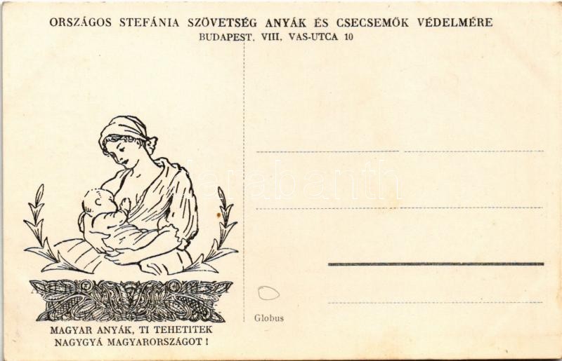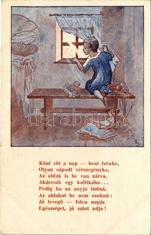 Description: Kint süt a nap - bent Irénke, olyan sápadt vérszegényke... Kiadja az Országos Stefánia Szövetség az anyák és csecsemők védelmére. Magyar Anyák ti tehetitek naggyá Magyarországot! / Hungarian propaganda postcard, Mother and child protective movement s: Sz. P.
