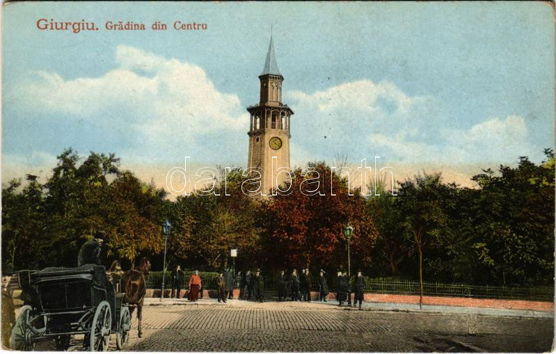 Giurgiu, Gyurgyevó, Gyurgyó; Gradina din Centru / park, clock tower, horse chariot