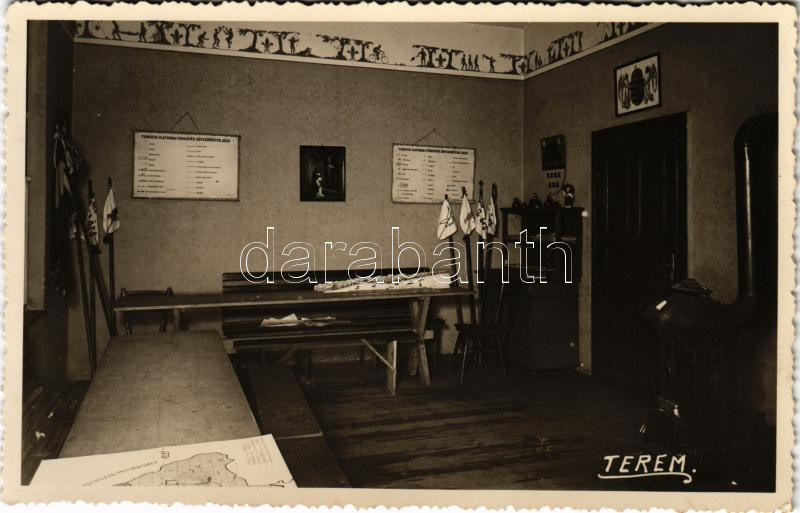 420. sz. "Julián barát" cserkészcsapat I. Otthona, terem belső, Turista (katonai) térképek egyezményes jelei a falon / Hungarian scout room interior (EK)