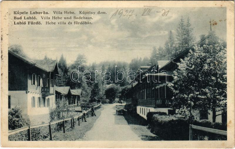 Description: 1927 Lublófüred, Lubló-fürdő, Kúpele Lubovna (Ólubló, Stará Lubovna); Kúpelny dom, Villa Hebe / Hebe nyaraló és fürdőház. Bernat Blayer kiadása / Villa Hebe und Badehaus / spa, bathhouse, villa (EM)