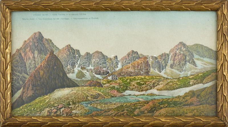 Description: Tátra, Magas-Tátra, Vysoké Tatry; Téry menedékház az Öt-tónál - 3-részes hajtatlan panorámalap üvegezett keretben, hátoldalon Schvarcz Andor miskolci üveg és porcelán áruház reklámja / Tery-Schutzhaus bei den Fünf Seen / lake, rest house - 3-tiled unfolded panoramacard in glazed frame (29 x 16 cm)