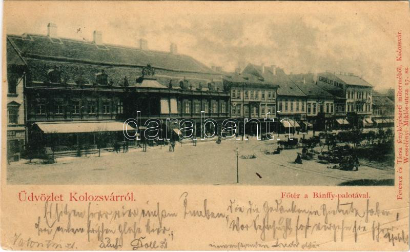 1898 (Vorläufer) Kolozsvár, Cluj; Fő tér, Bánffy palota, piac, Erdélyi Bank, Kováts P. fiai és Böckel üzlete. Ferencz és Társa kiadása / main square, palace, market, bank, shops (EB)