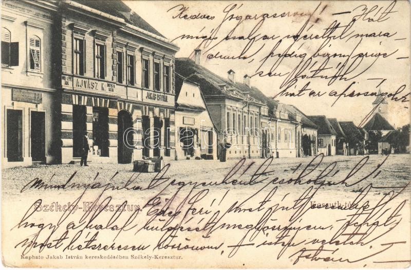 1906 Székelykeresztúr, Kristur, Cristuru Secuiesc; Kossuth tér, Ajvász K., Zimmermann, Jakab István üzlete és saját kiadása / square, shops (fl)