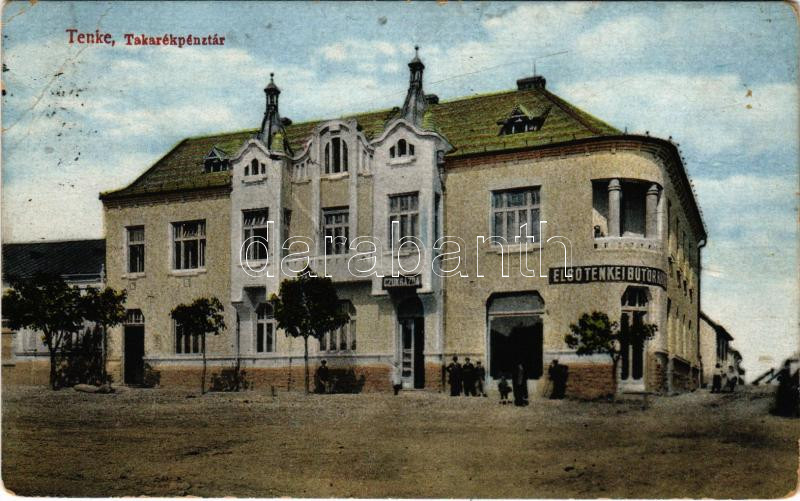 1912 Tenke, Tinca; Takarékpénztár, cukrászda, Első tenkei bútorraktár....