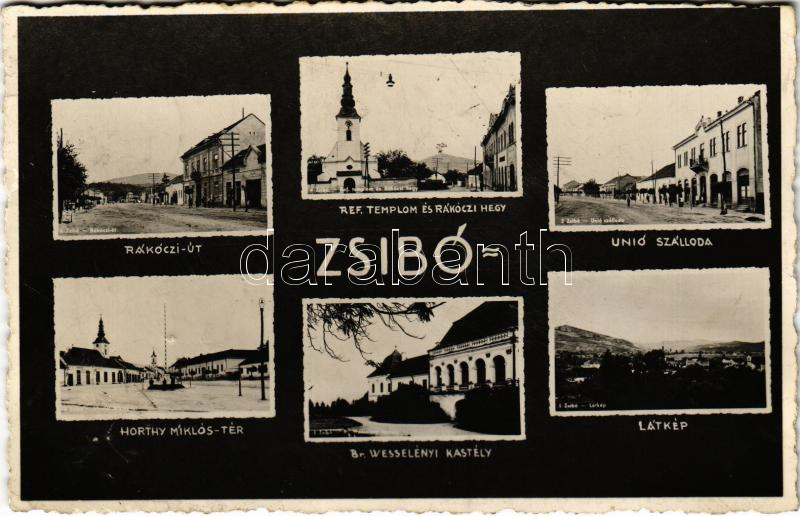 1942 Zsibó, Jibou; Rákóczi út, Református templom és Rákóczi-hegy, Unió szálloda, Horthy Miklós tér, Országzászló, Br. Wesselényi kastély, látkép / street view, Calvinist church, hotel, square with Hungarian flag, castle (tűnyomok / pin marks)