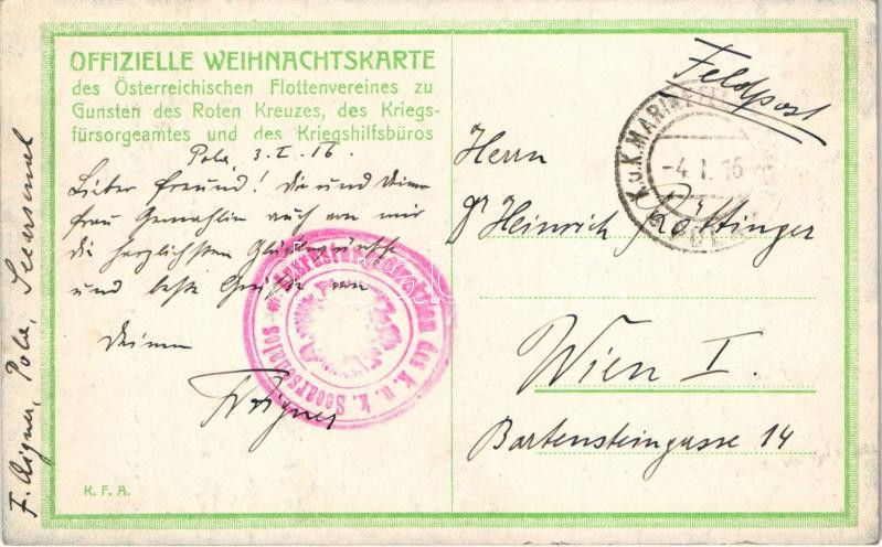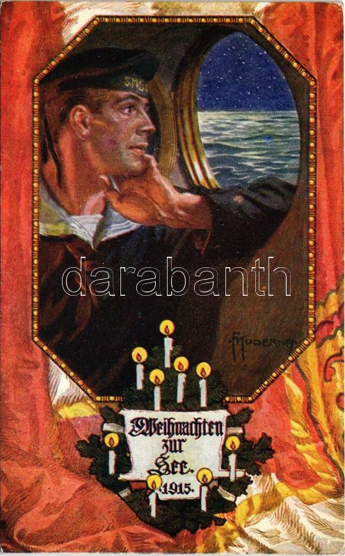 Description: 1916 Weihnachten zur See 1915. Offizielle Weihnachtskarte des Österreichischen Flottenvereines zu Gunsten des Roten Kreuz, des Kriegsfürsorgeamtes und des Kriegshilfsbüro. K.u.K. Kriegsmarine / WWI Austro-Hungarian Navy Christmas greeting art postcard with mariner s: F. Kuderna
