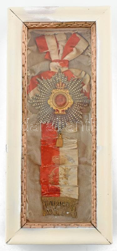 Description: Lengyel ereklye, egy ismeretlen személy golyó ütötte szövetdarabja koronás pecséttel díszített csillag formájú kitüntetésként, üvegezett keretben. 25 cm / Polish historical relic