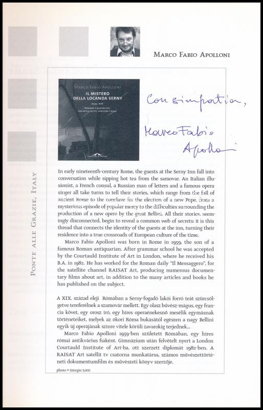 Európai elsőkönyvesek fesztiváljának könyve autográf aláírásokkal Marc... https://www.darabanth.com/en/432-Online-auction/432.0/Art-and-other-collectibles/Autographs~500021/Europai-elsokonyvesek-fesztivaljanak-konyve-autograf-alairasokkal-Marco-Fabio-Appoloni-Cr~II2785654